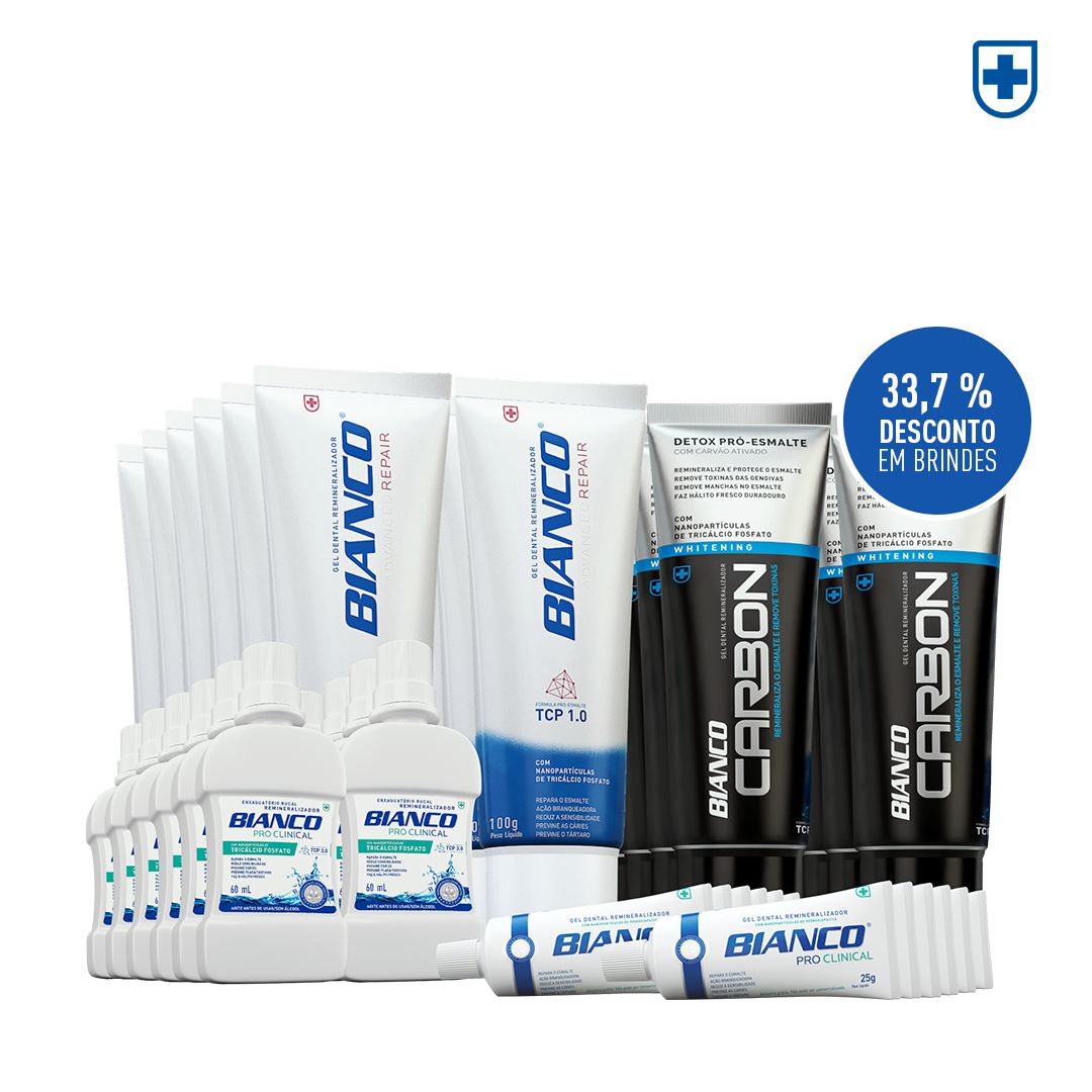 Esse Combo contém 12 unidades do Creme Dental CARBON (NÃO CONTÉM FLÚOR) + 12 unidades do Creme Dental ADVANCED REPAIR (CONTÉM FLÚOR) que aliados a fórmula exclusiva de TCP (Tricálcio Fosfato) 1.0 de BIANCO REPAIR e TCP 3.0 de BIANCO CARBON são capazes de recompor o esmalte perdido, restaurando a camada mineral e devolvendo a textura e dureza originais, protegendo ainda mais seus dentes e deixando-os mais brancos**.